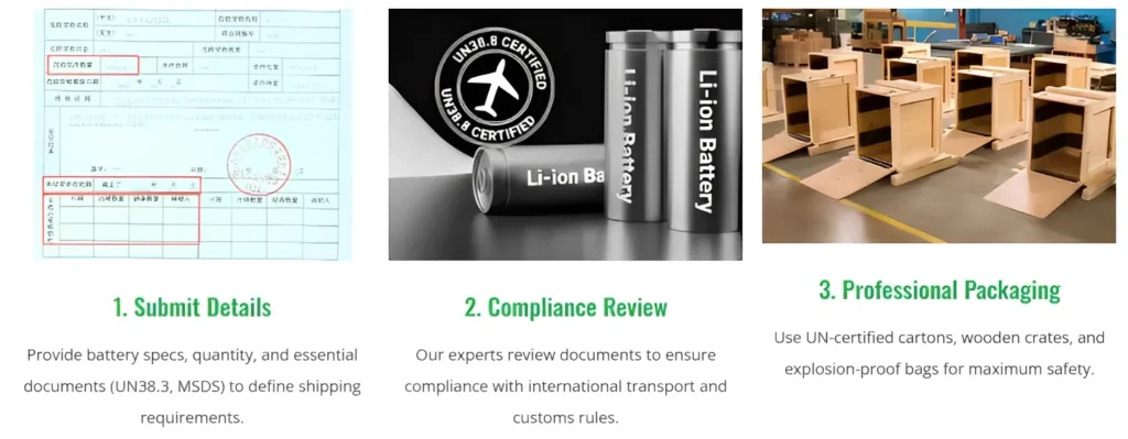Typically, shippers need to provide compliance documents such as UN38.3 test reports, MSDS, and product specifications. Our team will guide you step by step through the documentation requirements.