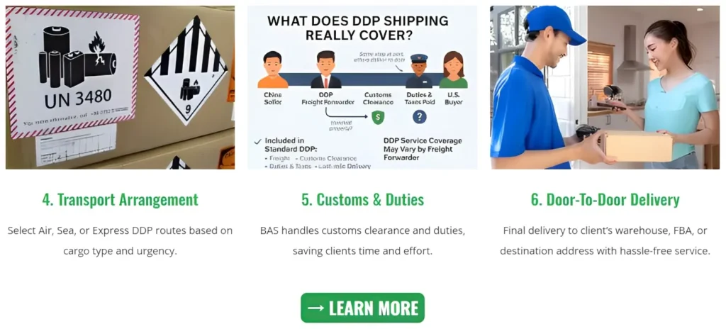 DDP lithium battery shipping means Delivered Duty Paid, where we handle the entire process of transporting lithium batteries—including freight, customs clearance, duties, and final delivery—so the consignee doesn’t need to deal with any hidden procedures or costs.