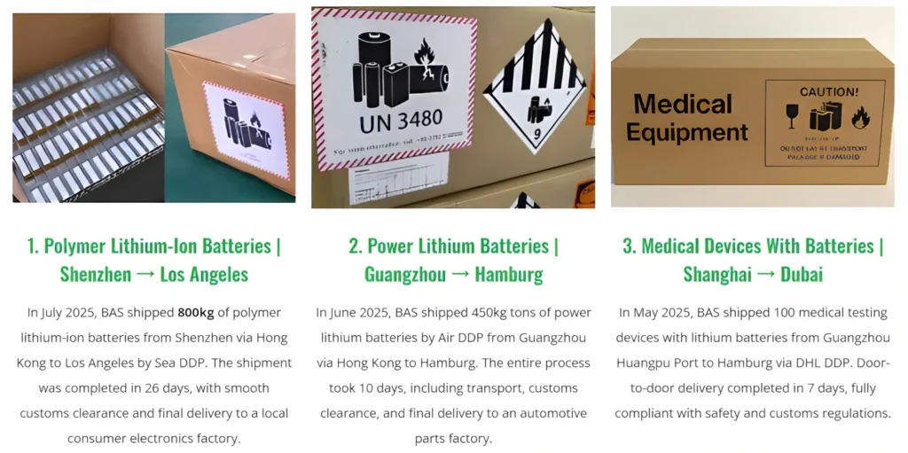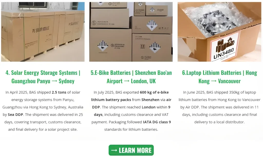 In July 2025, BAS exported 600 kg of e-bike lithium battery packs from Shenzhen via air DDP. The shipment reached London within 9 days, including customs clearance and VAT payment. Packaging followed IATA DG class 9 standards for lithium batteries.