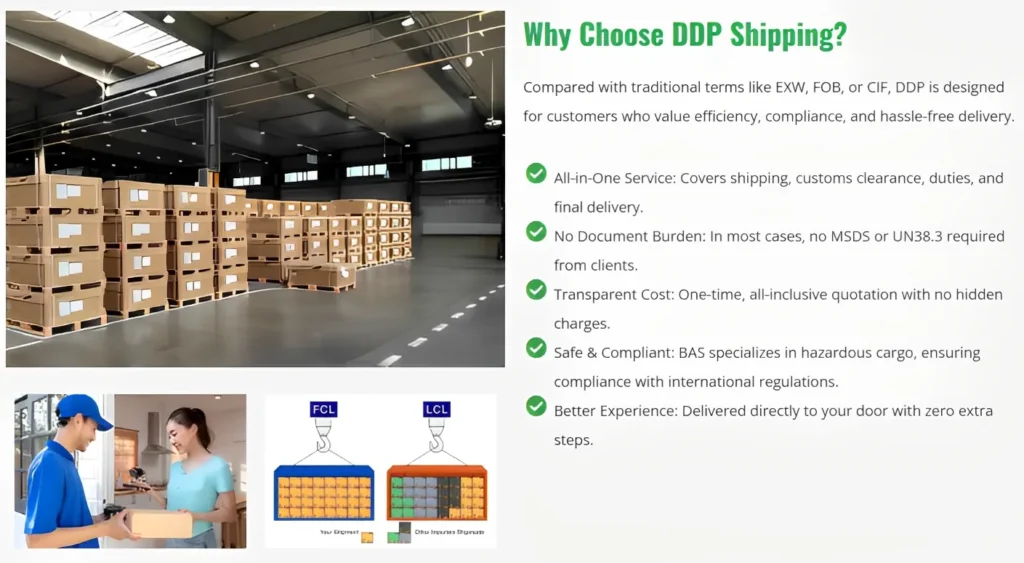 Compared with traditional terms like EXW, FOB, or CIF, DDP is designed for customers who value efficiency, compliance, and hassle-free delivery.